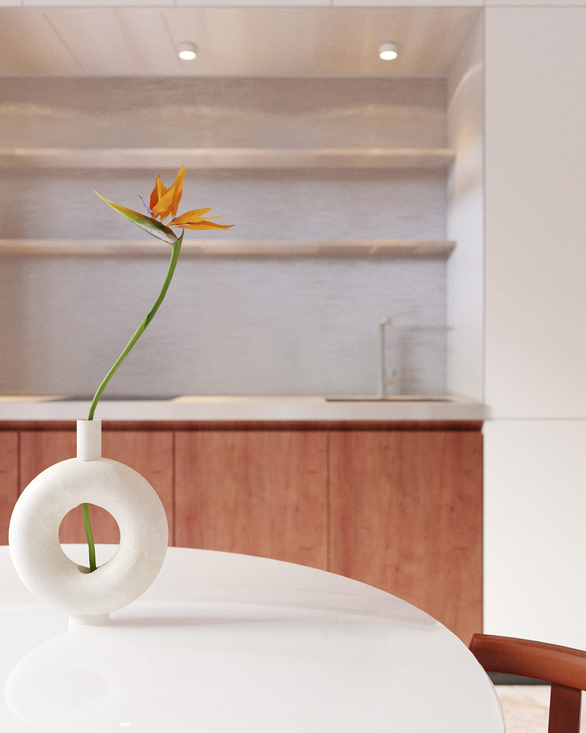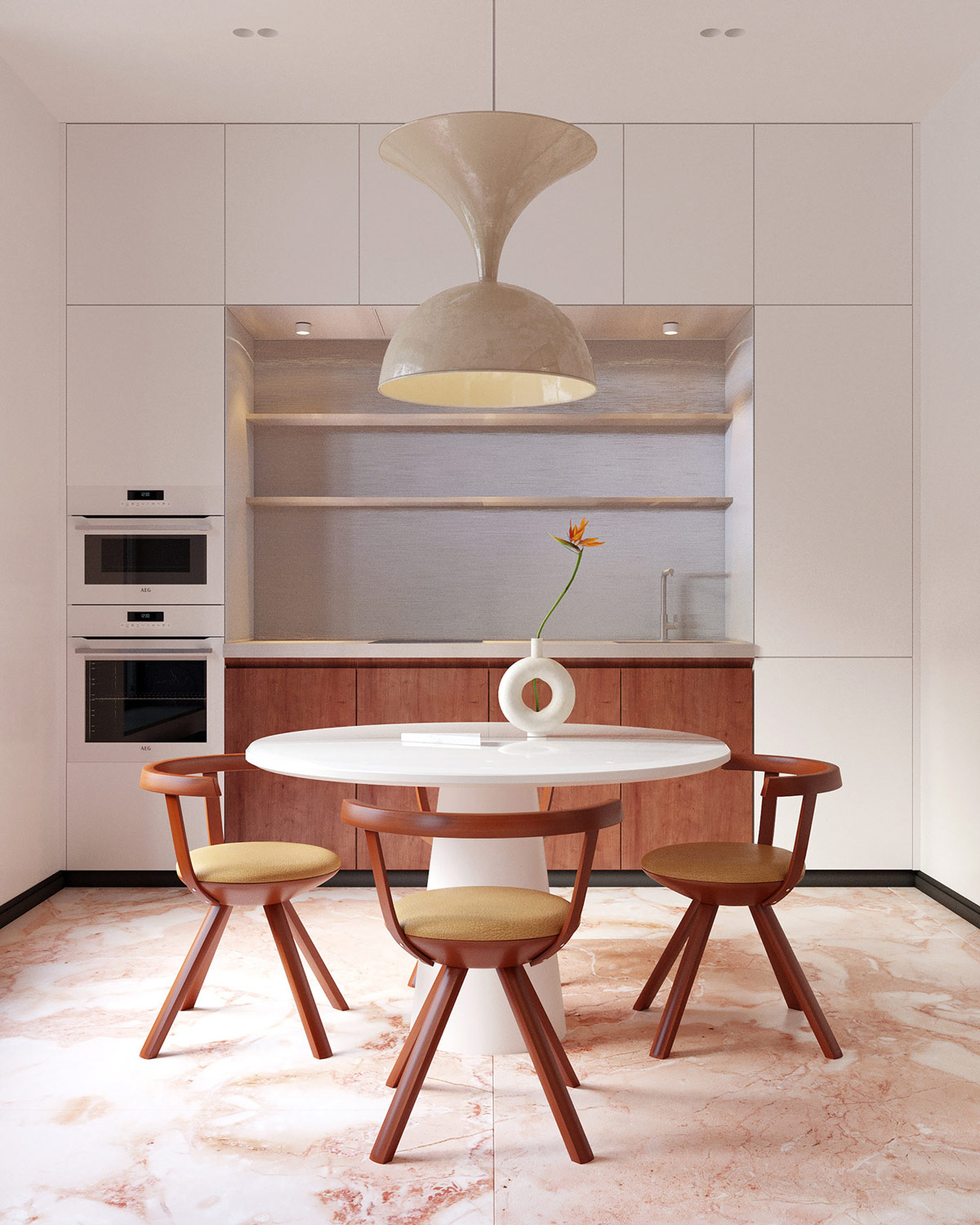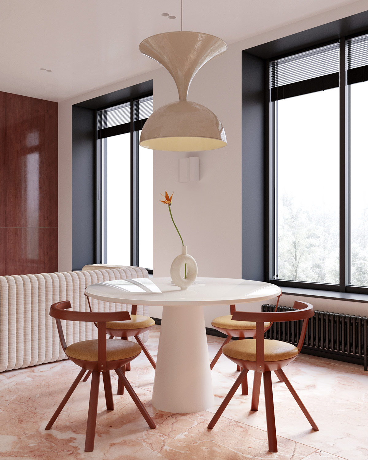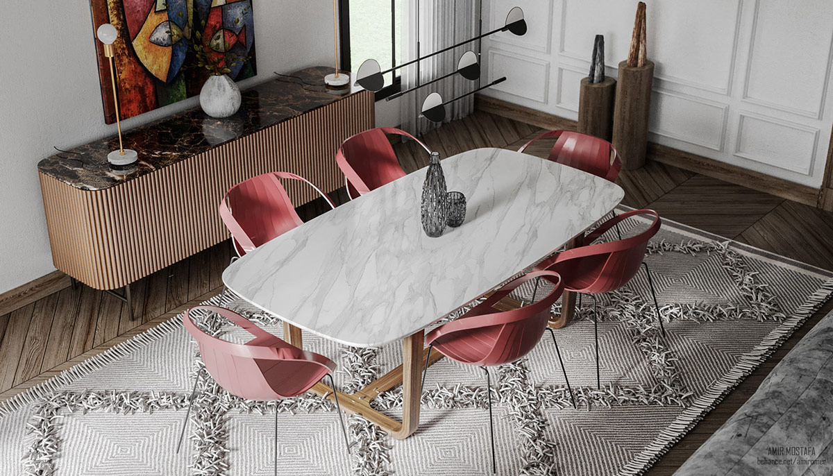 Изящный подвесной светильник для столовой выглядит как произведение искусства из керамики, подвешенное над обеденной зоной. Очертания уникальных обеденных стульев переворачивают силуэт подвески с ног на голову.