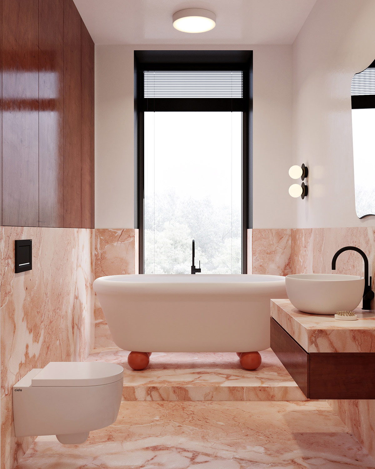 Обработка пола из красного мрамора, которую мы видели в кухонной столовой, снова используется в ванной, и на этот раз распространяется и на стены. Причудливая ванна стоит на коренастых сферических клешнях.