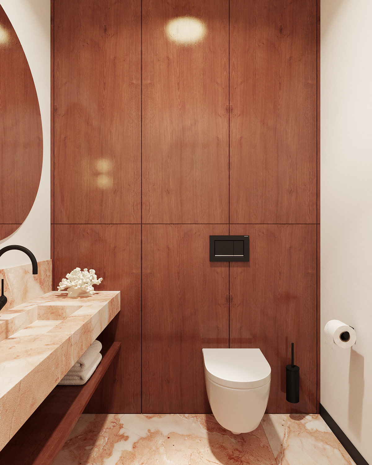 Красный мрамор закручивается вдоль туалетного столика, где он дополняется богатыми деревянными панелями на примыкающей скрытой стене цистерны. Черные матовые аксессуары для ванной комнаты придают классическим материалам современный вид.