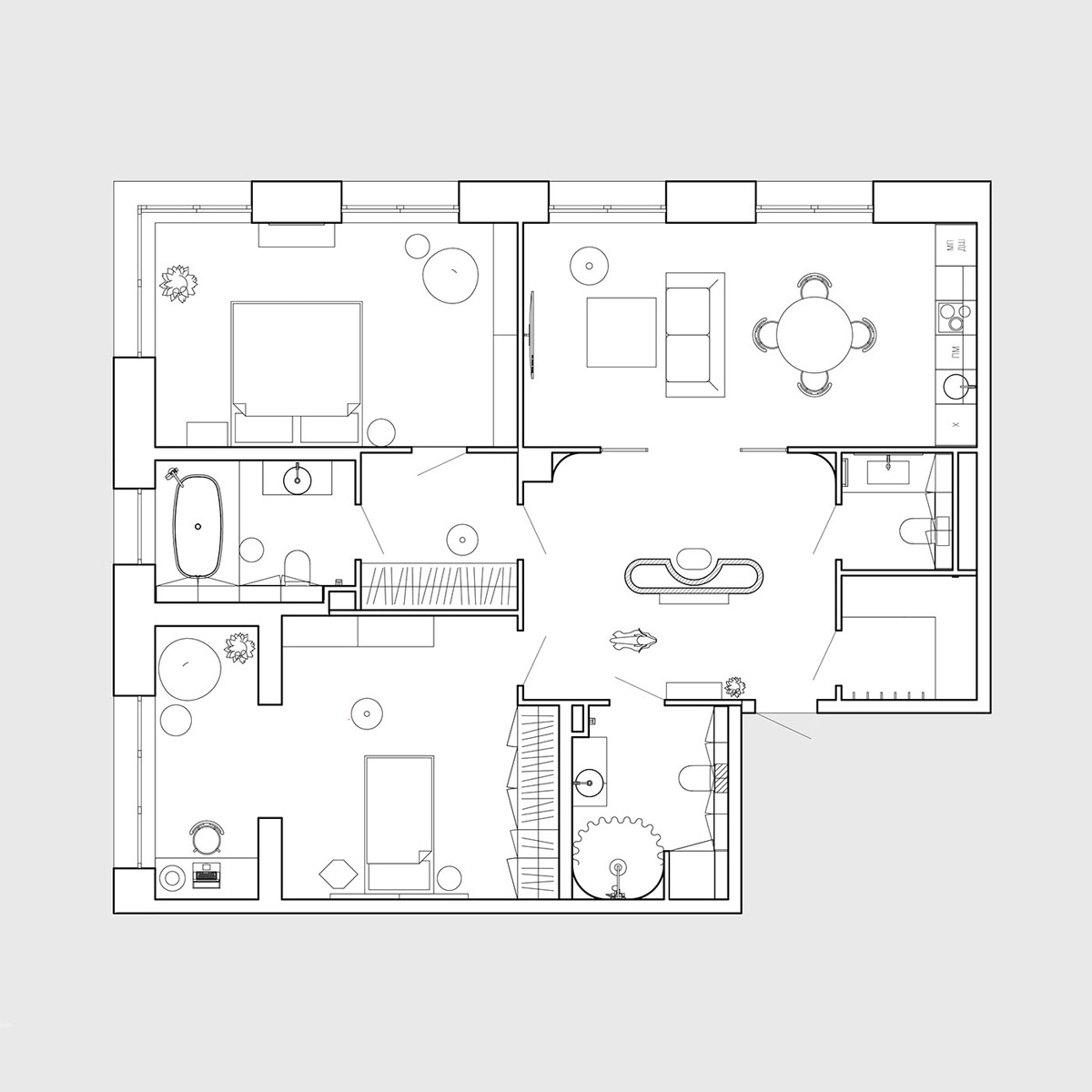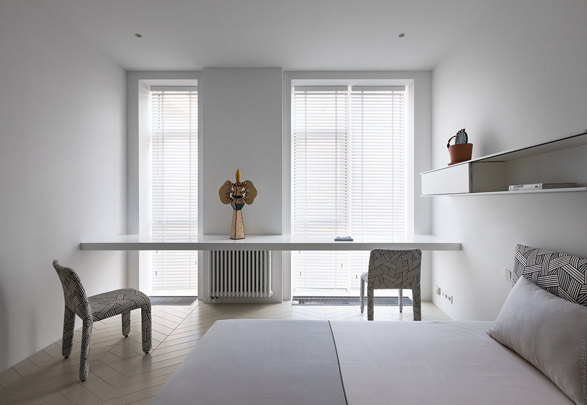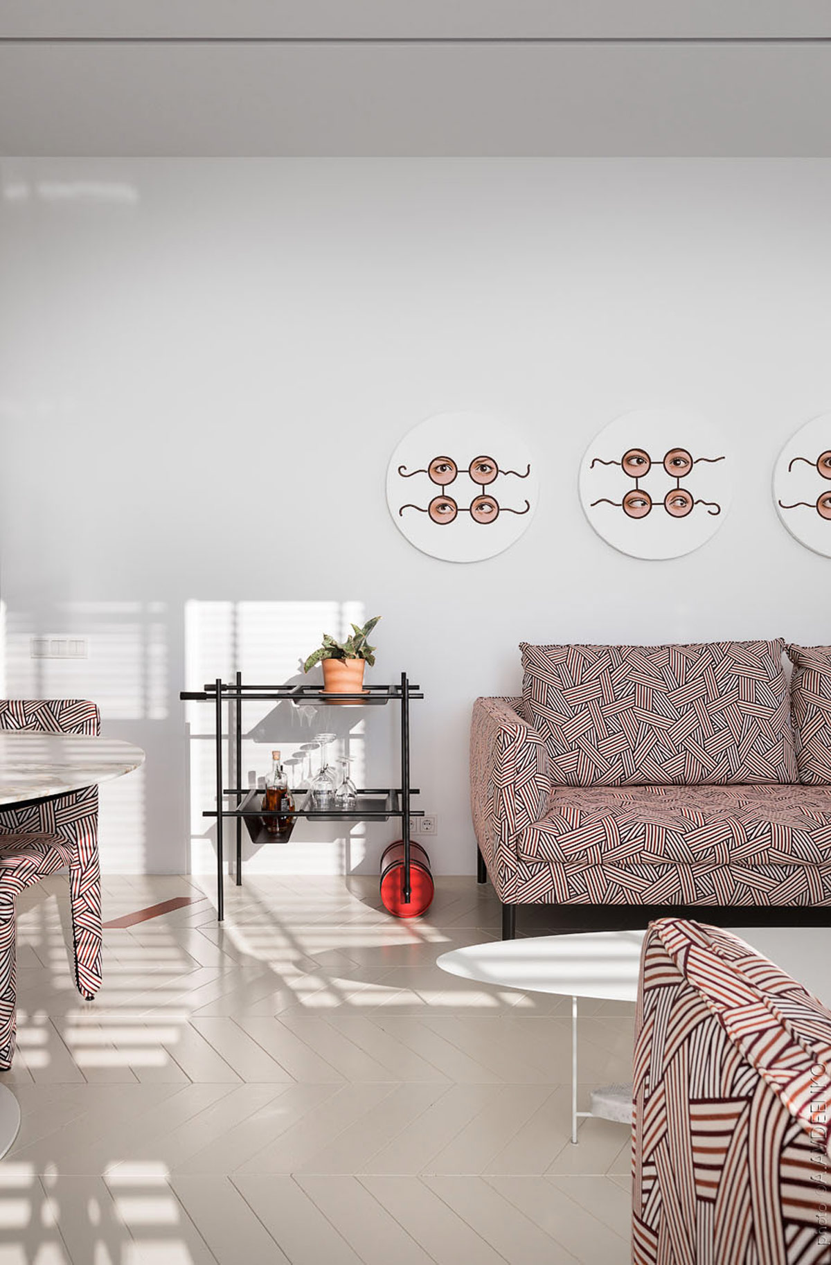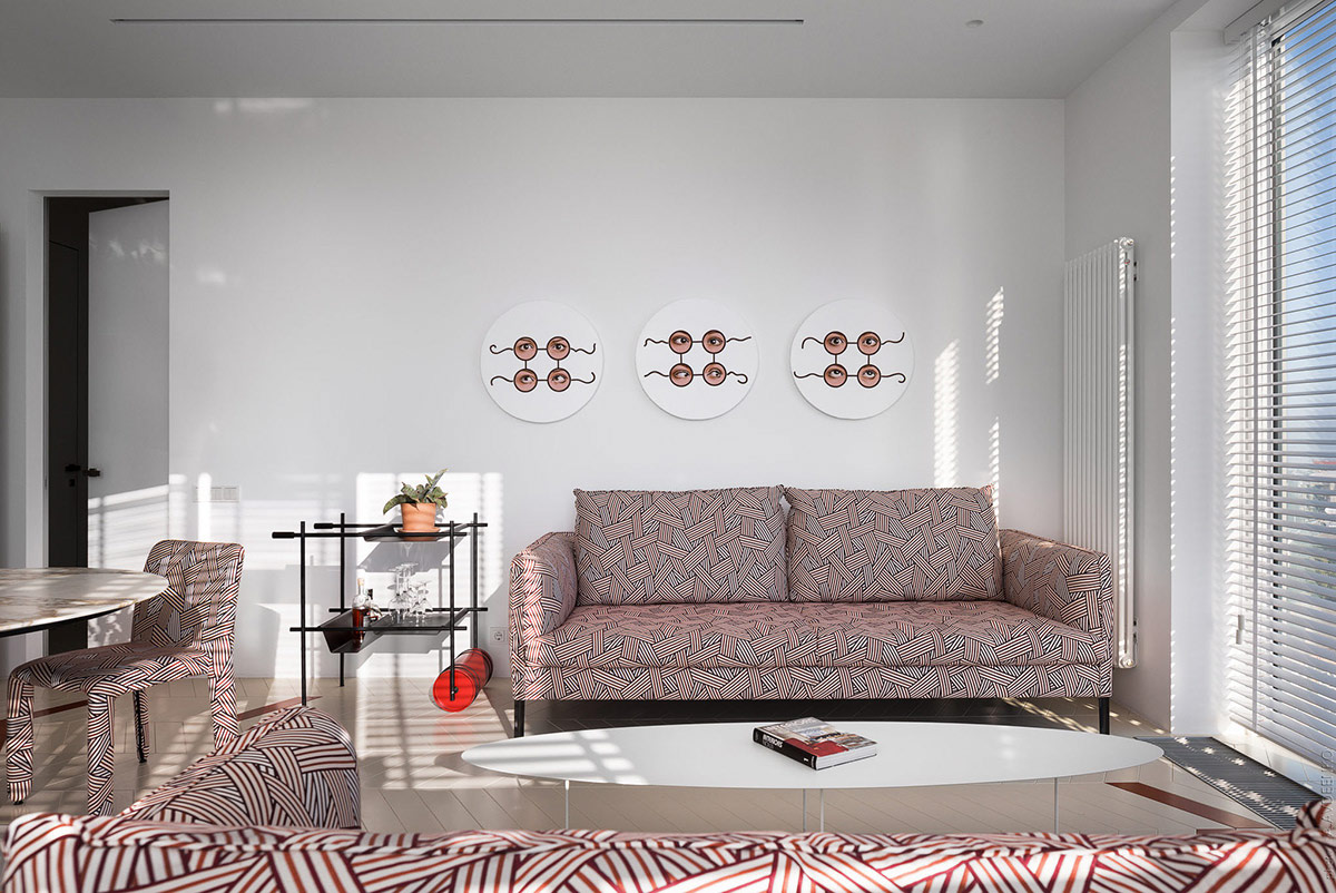 Эта дизайнерская концепция, расположенная в Киеве, Украина, основана на строгости и минимализме. Одна и та же ткань была использована для покрытия двух диванов и соседних обеденных стульев, создавая смелую насыщенность рисунка.