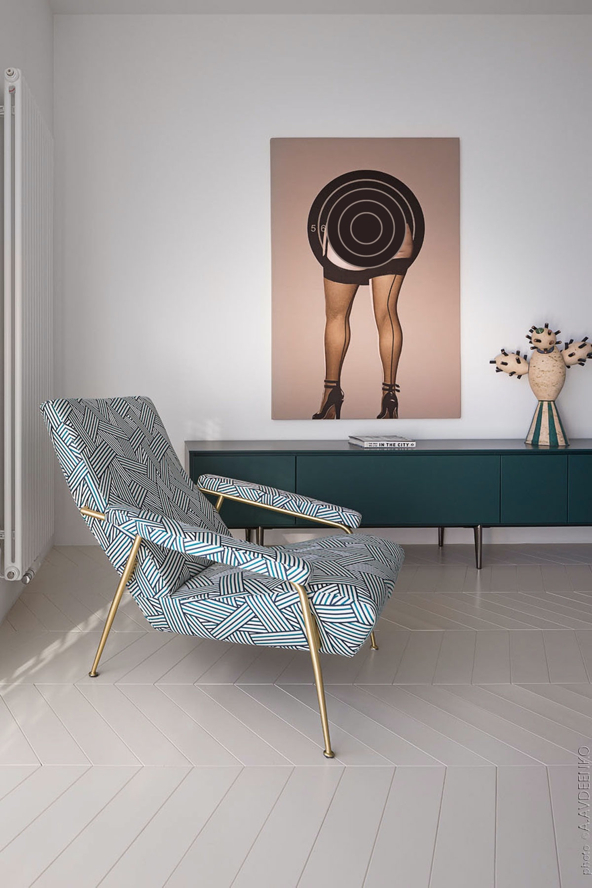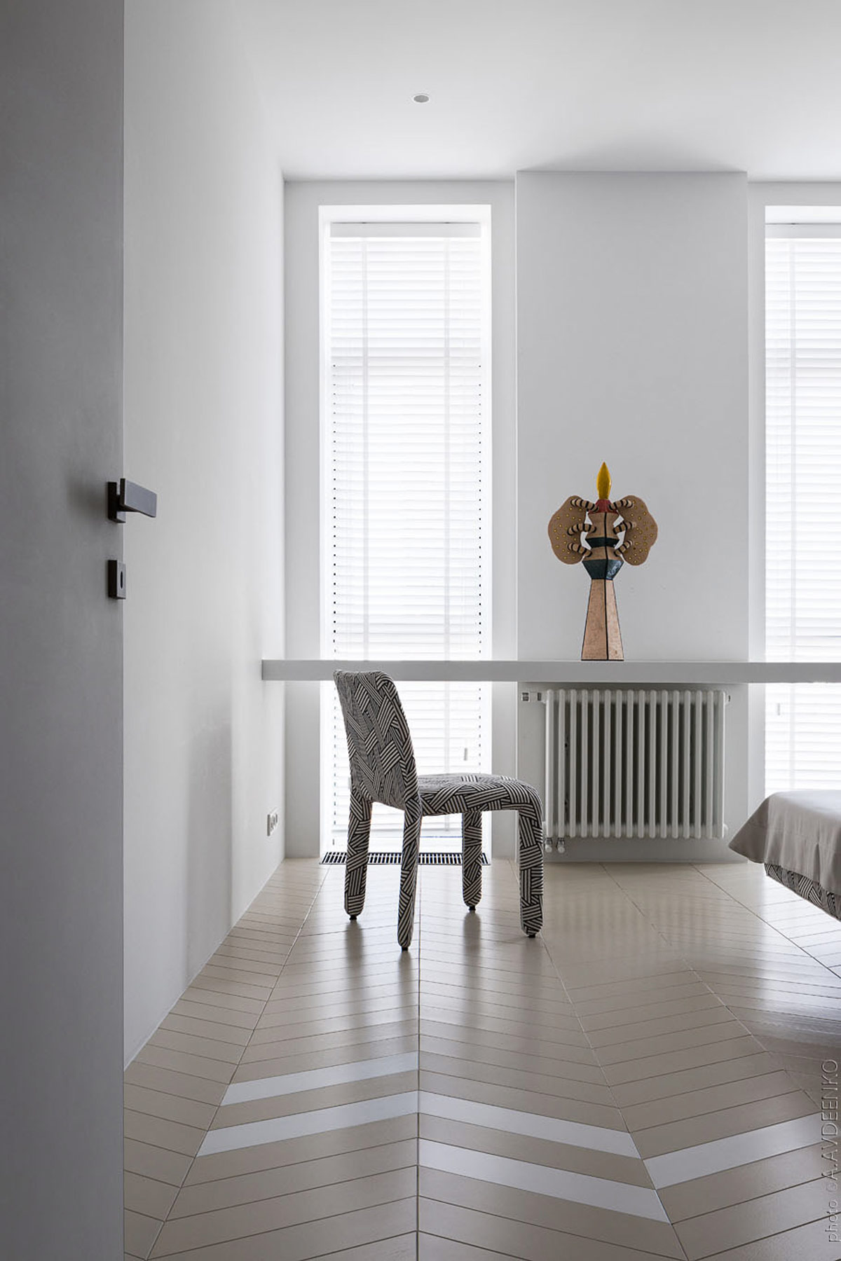 Двухцветный шевронный пол создает необычный акцент и создает углы, которые дополняют уникальное покрытие стула.