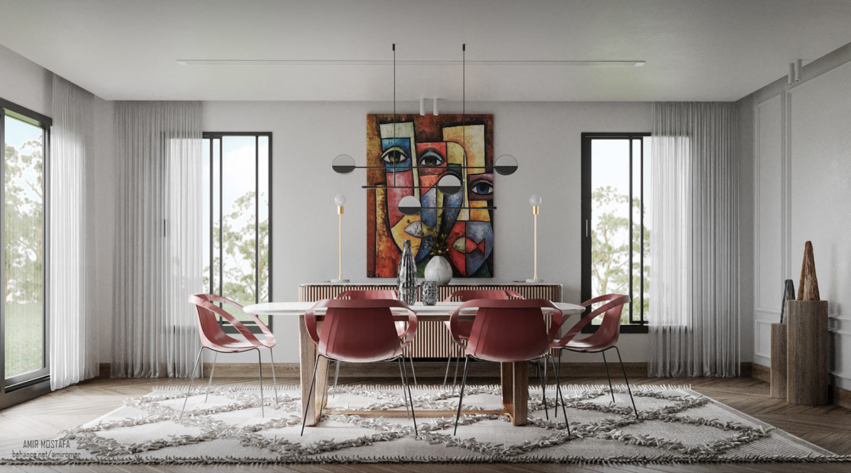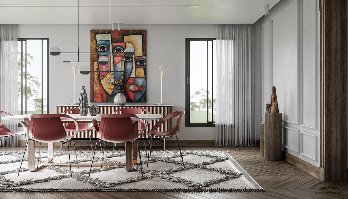 Скульптурный столовый подвесной светильник перекликается с настенным искусством, словно являясь частью одной художественной инсталляции.