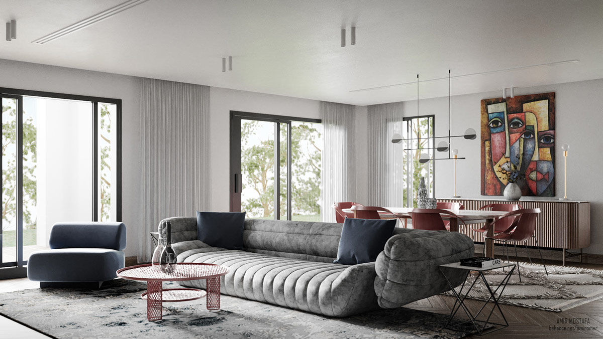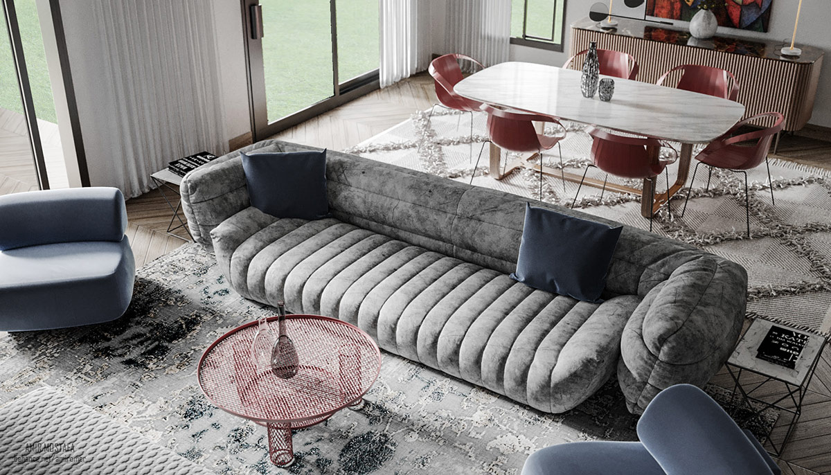 Тканевый стеганый диван является творческим фокусом в нашем первом художественном жилом пространстве, где мягкий белый и приглушенный красный декор создают богатый контраст. Стеклянный журнальный столик держится на скульптурных формах. Его вершину украшают трехмерные абстрактные формы.