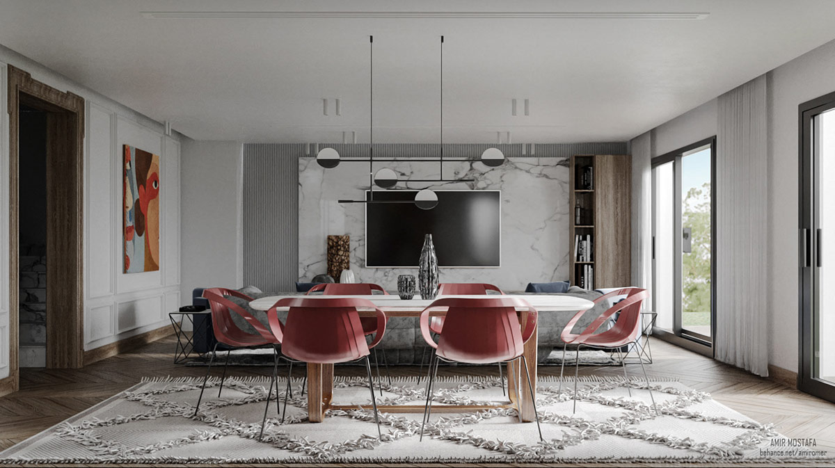 Современные обеденные стулья притягивают красный акцент к задней части гостиной. Текстурированный ковер создает геометрический рисунок.