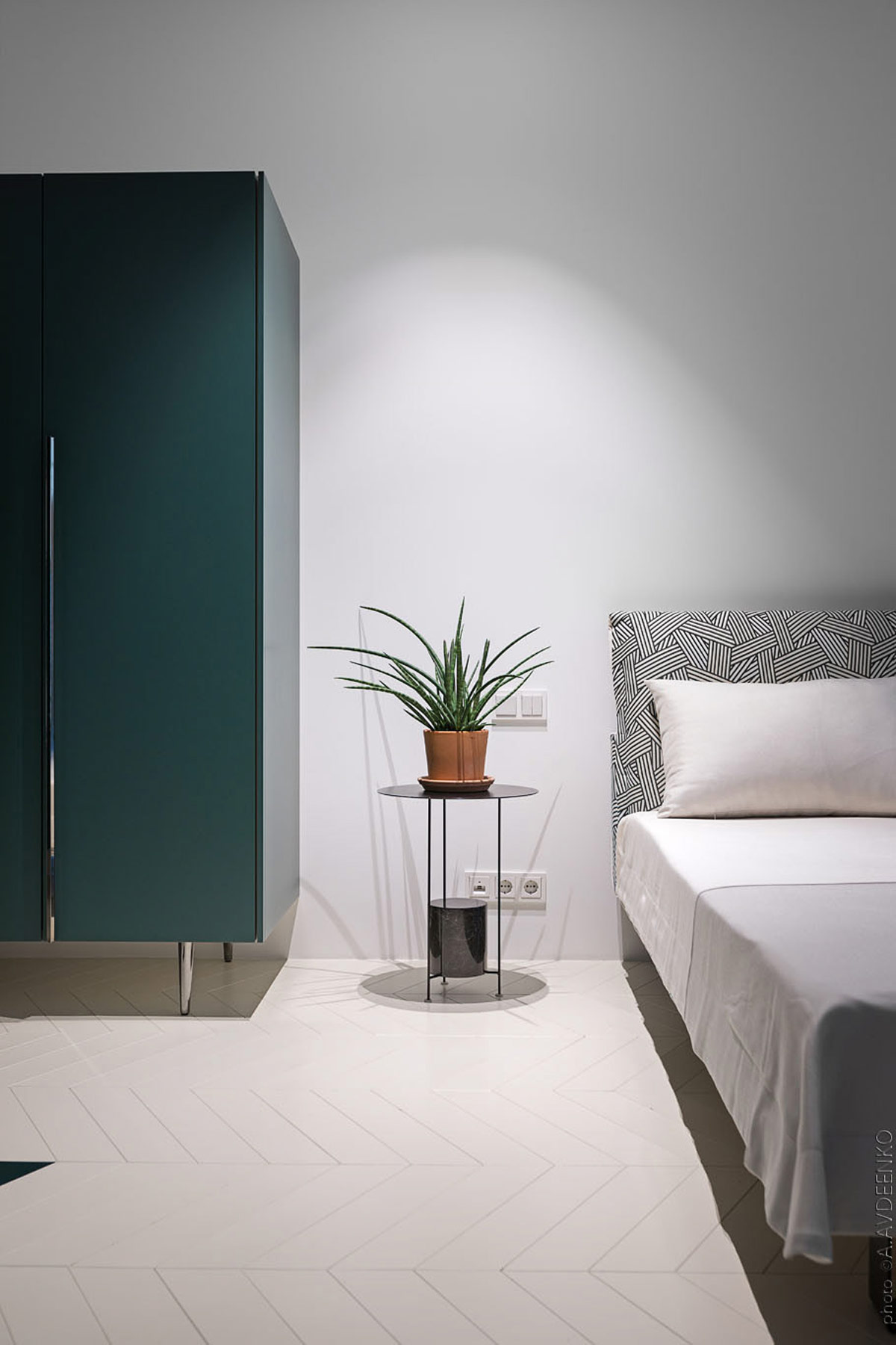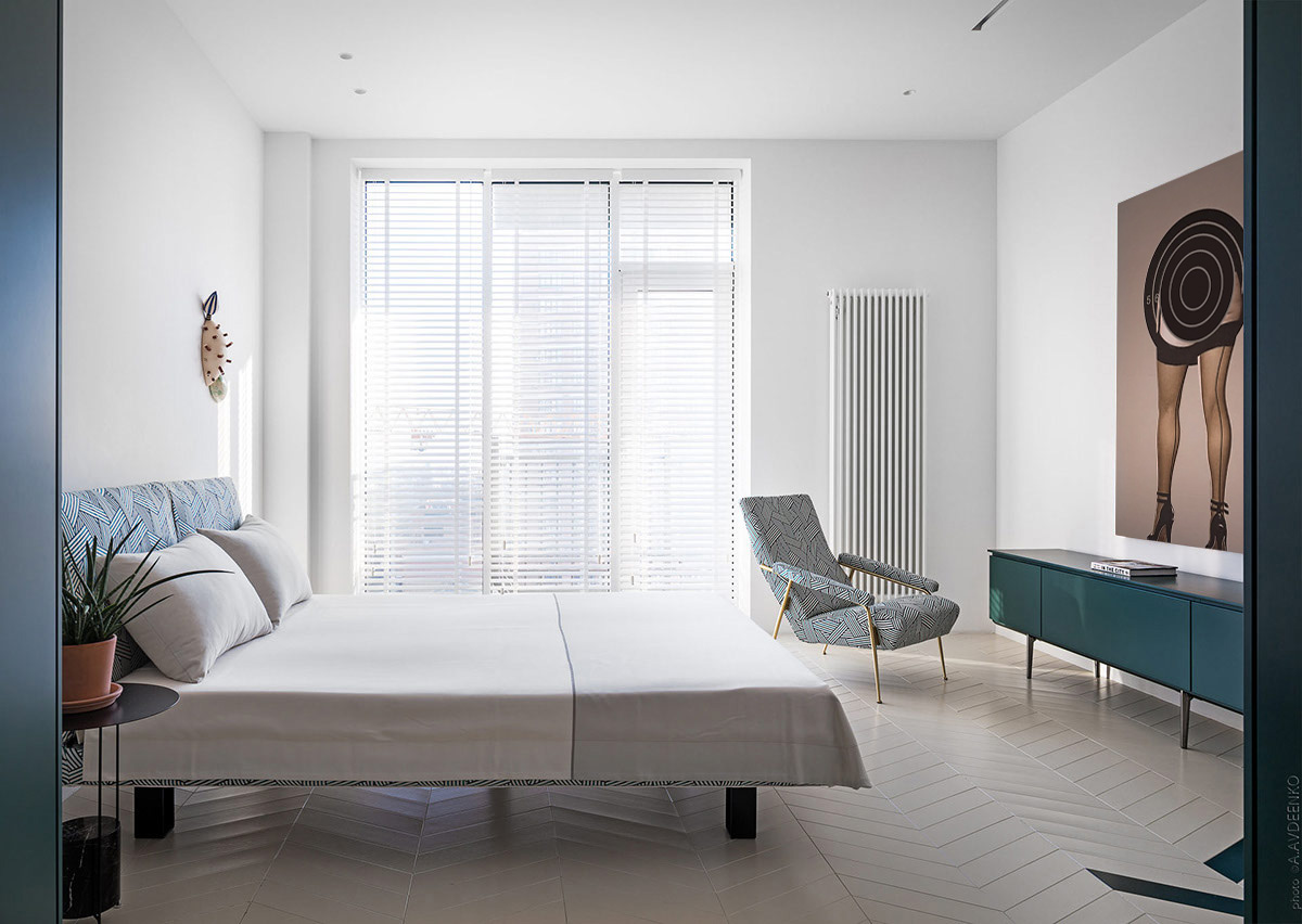 Бирюзовая версия геометрической ткани была использована на индивидуальном изголовье кровати-платформы. Общий рисунок создает гармонию с гостиной, в то время как более холодная цветовая гамма создает совершенно другую атмосферу.