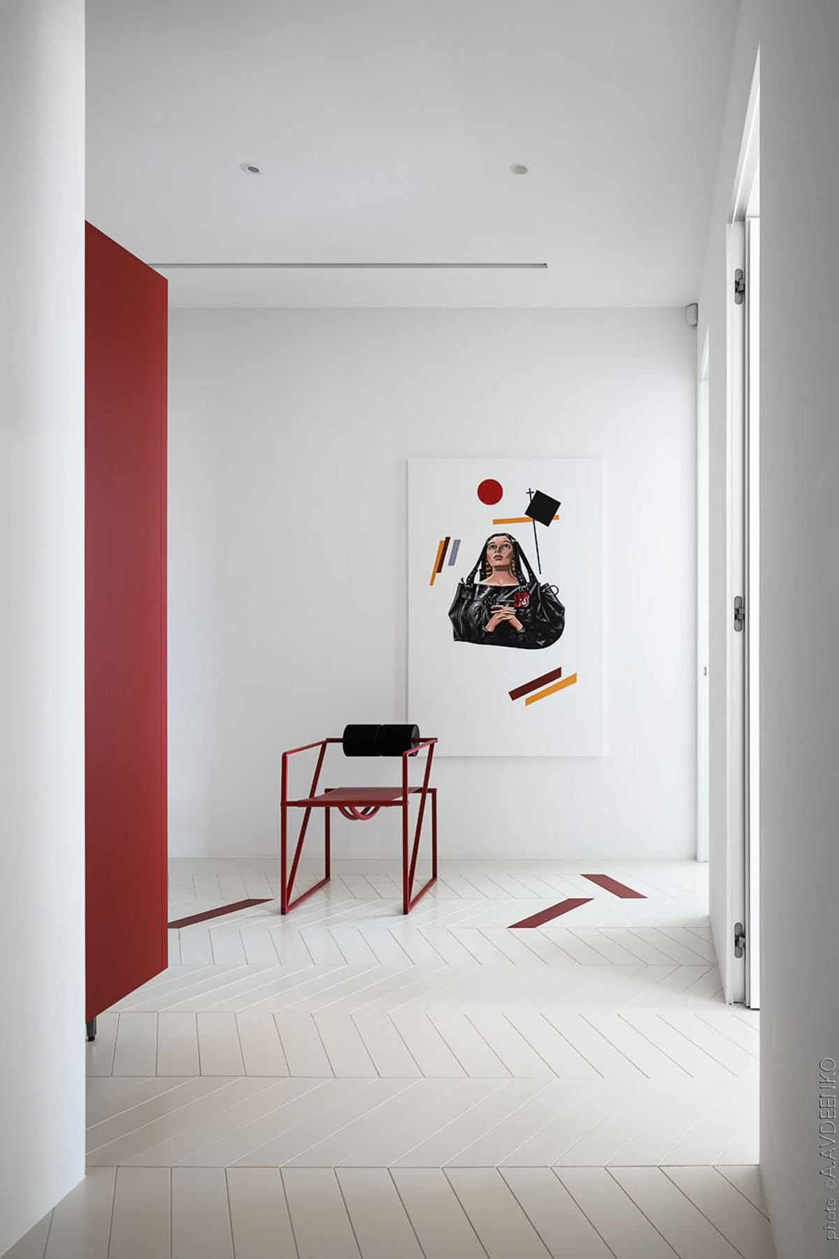 Художественное переходное пространство представляет собой полноценную художественную инсталляцию со скульптурным стулом и творческой обработкой пола, которая взаимодействует с современными произведениями искусства.