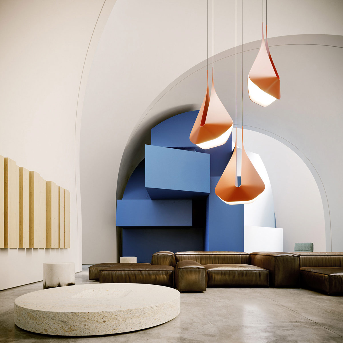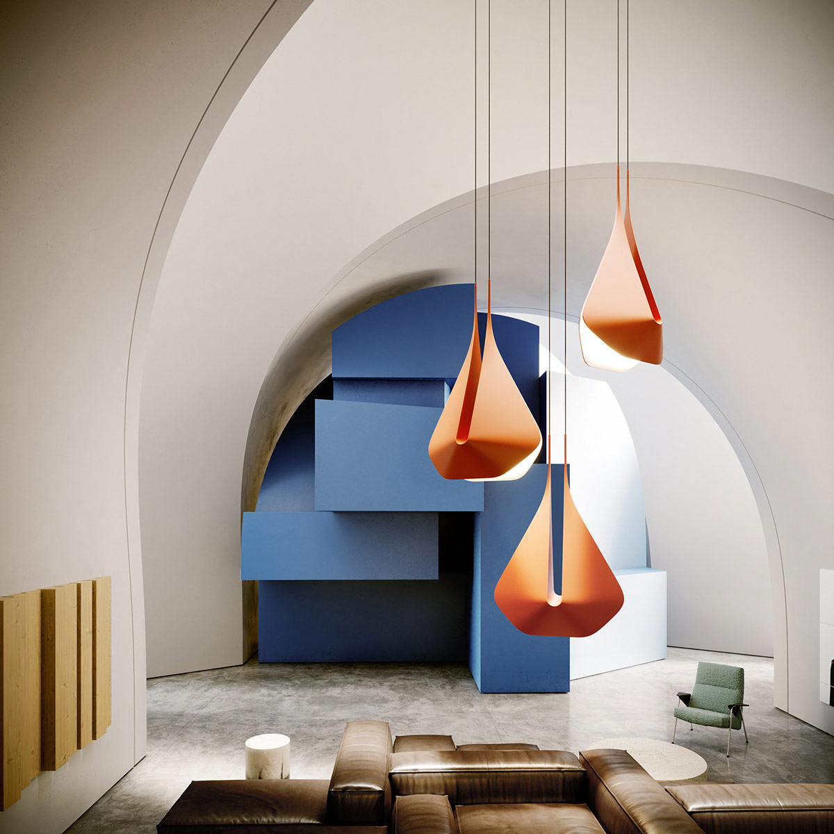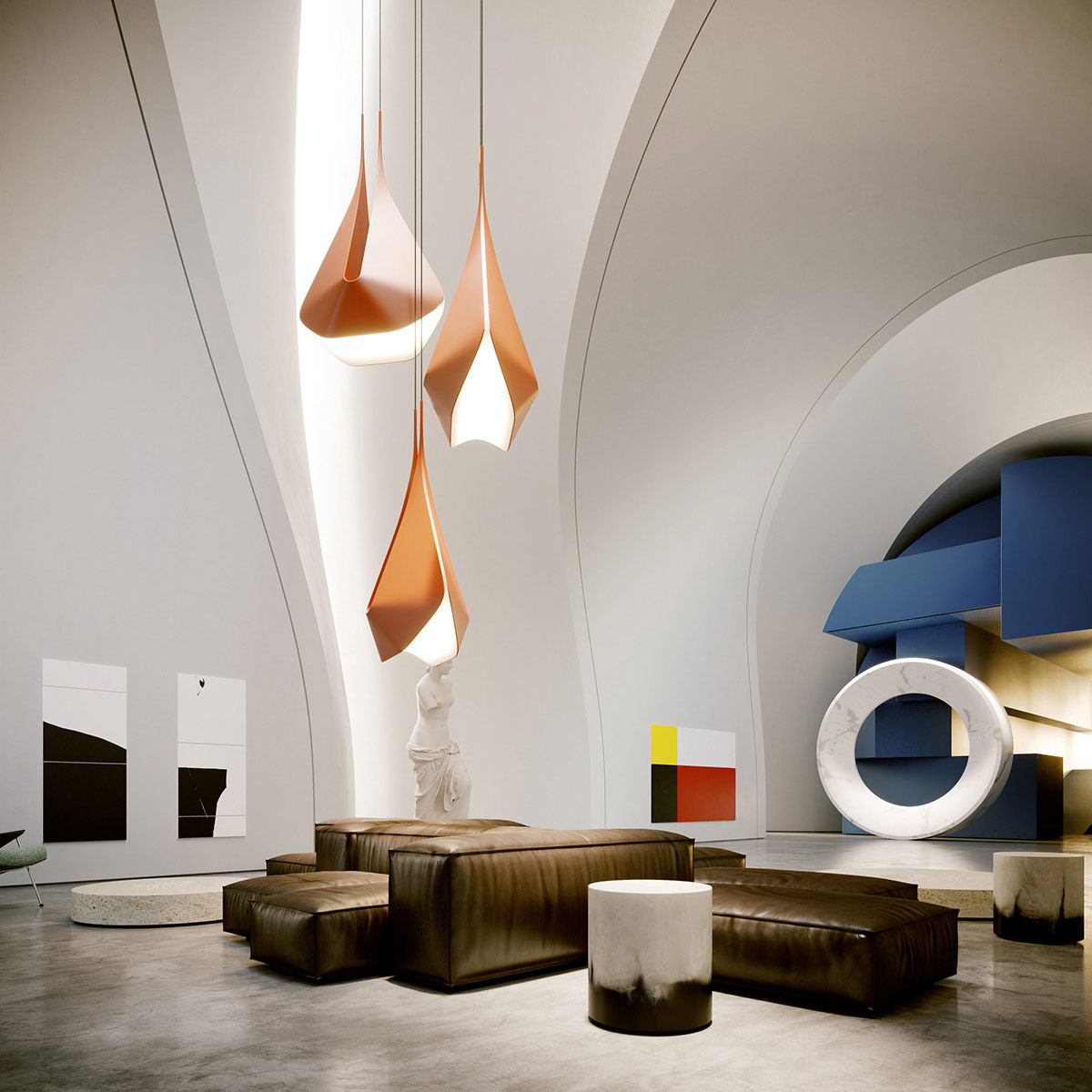 Уникальные подвесные светильники падают с высокого потолка, словно гигантские капли-оригами.
