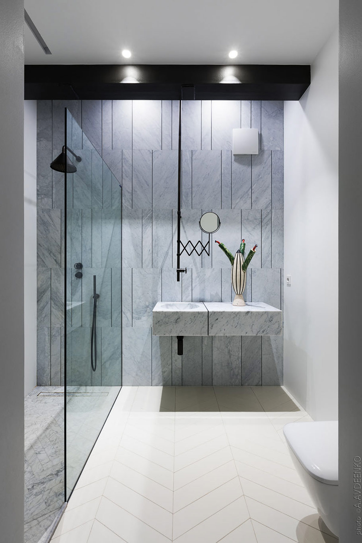 Синий мрамор тонко оттеняет схему ванной комнаты под абсолютно черными светильниками. Интригующий керамический предмет украшает мраморный туалетный столик.