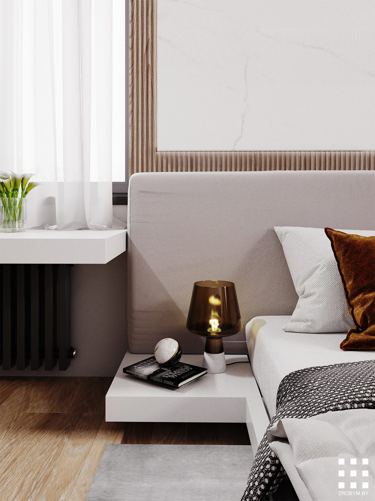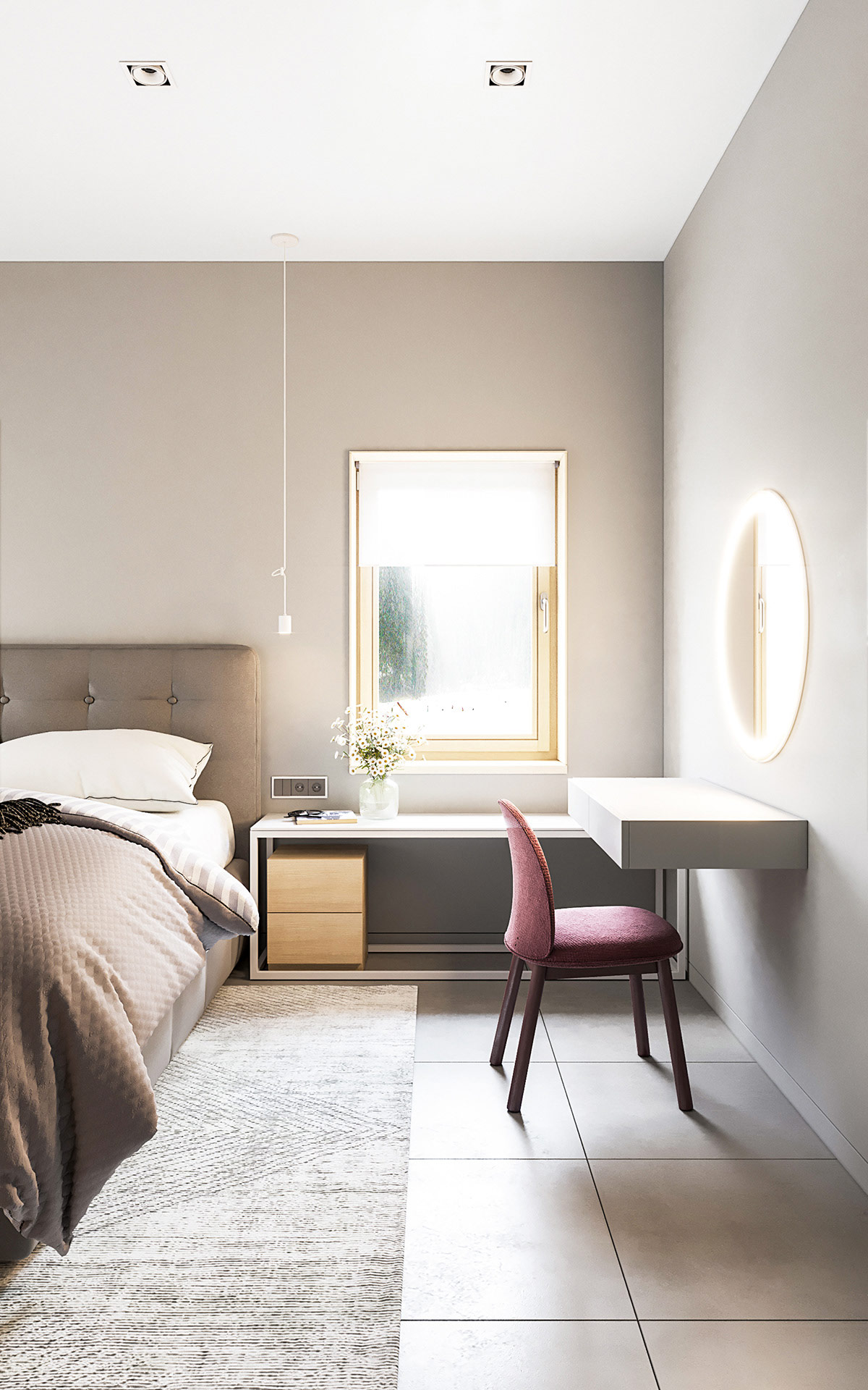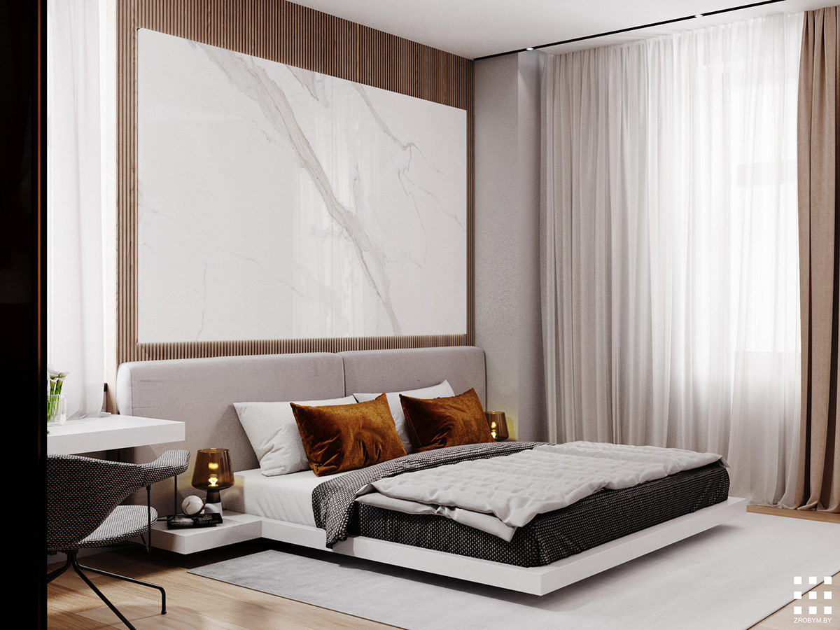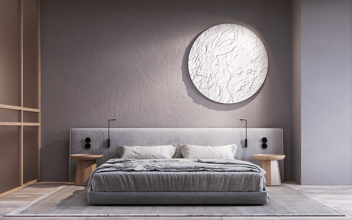 Декор в главной спальне становится темнее, с дымчато-серыми стенами и подобранной по цвету кроватью-платформой.