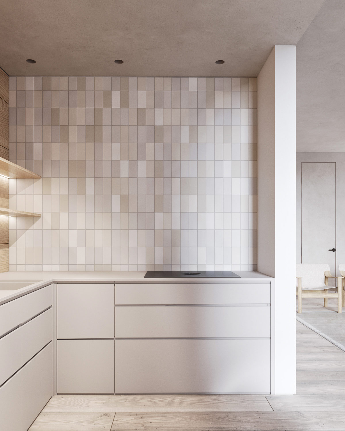 Другая стена кремовой плитки служит фартуком для плиты на минималистской кухне.