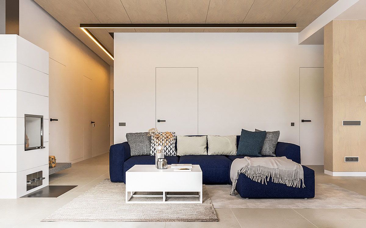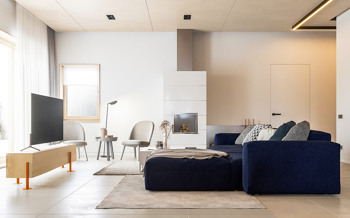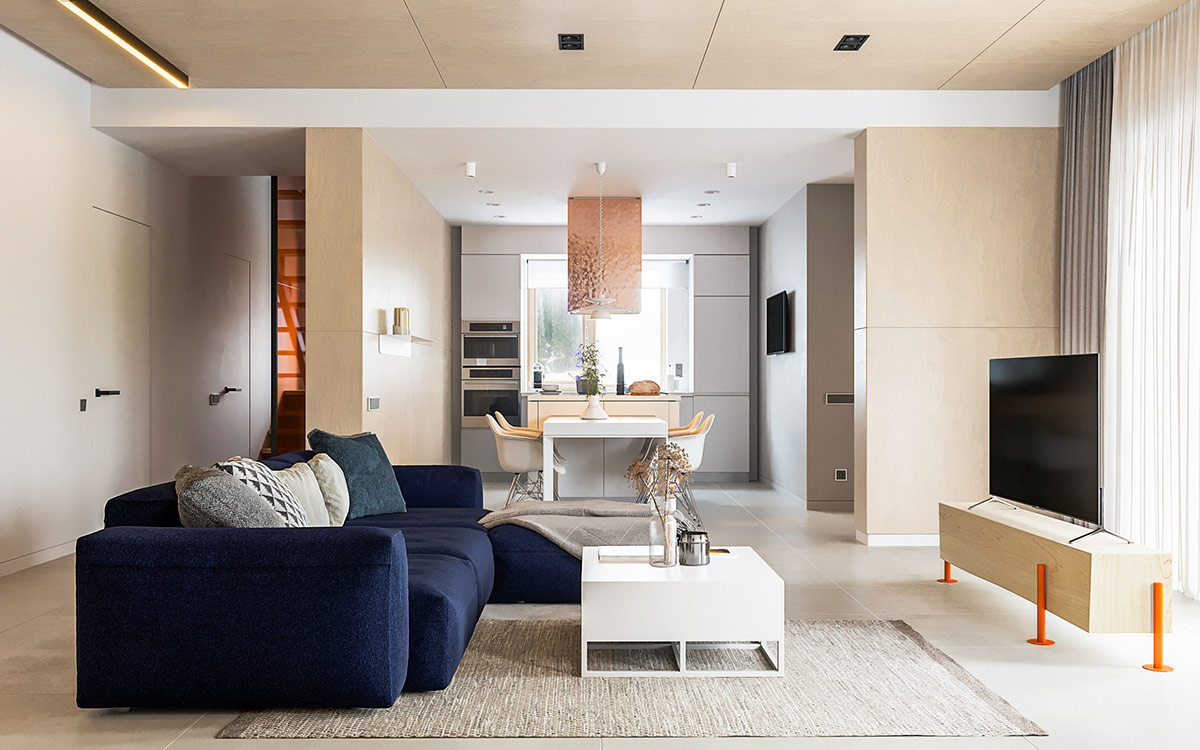Наша следующая домашняя экскурсия — небольшой дом площадью 118 квадратных метров в Приозерске, Россия. Королевский синий элемент входит в белый, светлое дерево и бледно-серый декор в виде глубокого современного дивана. Забавные оранжевые акценты играют на тумбе под телевизор.