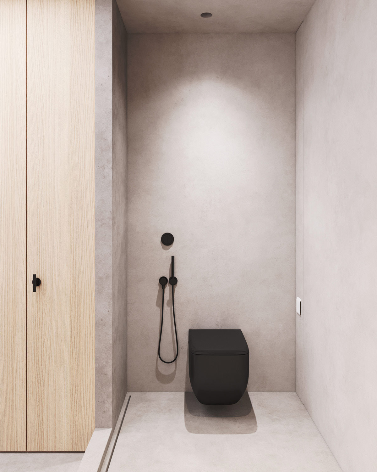 На другой стороне приподнятой бетонной платформы находится черный подвесной унитаз со скрытым бачком.