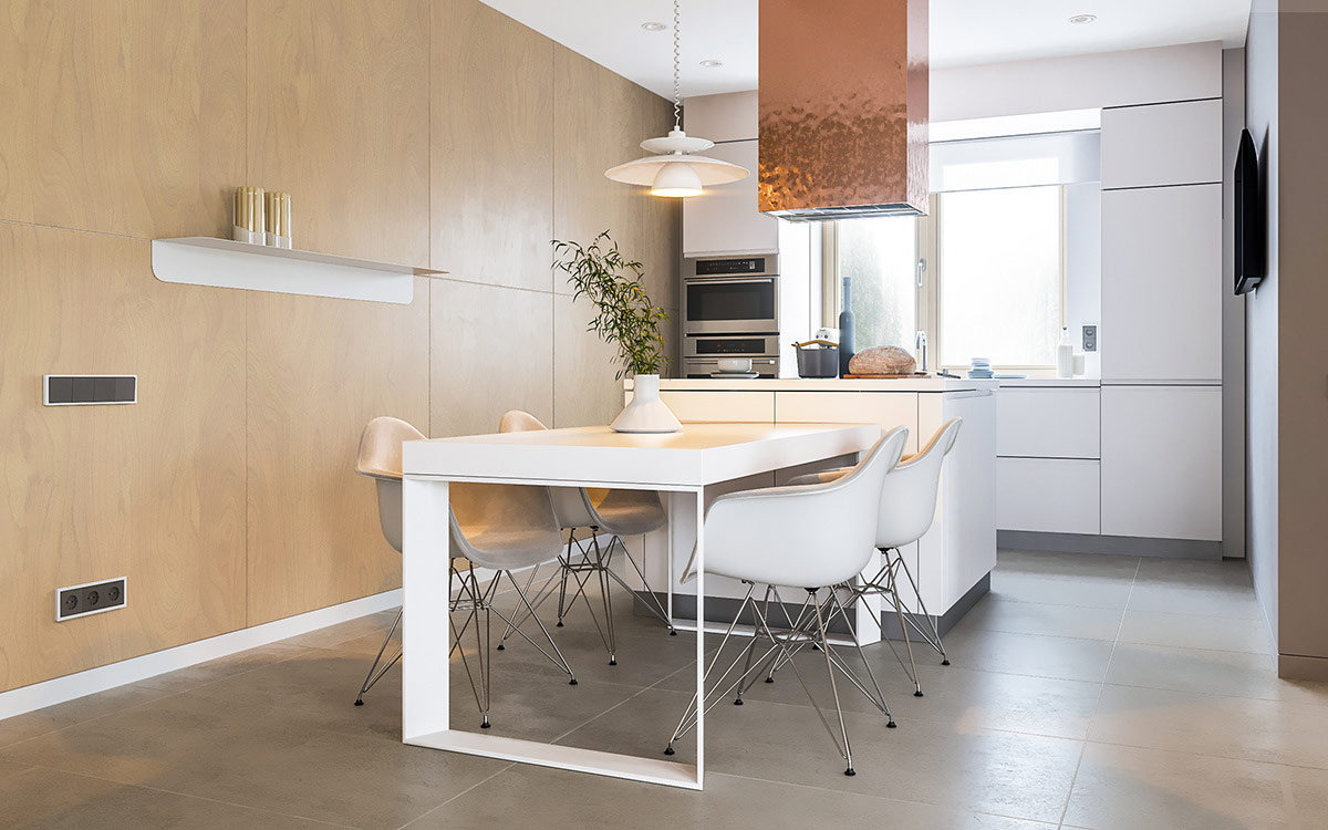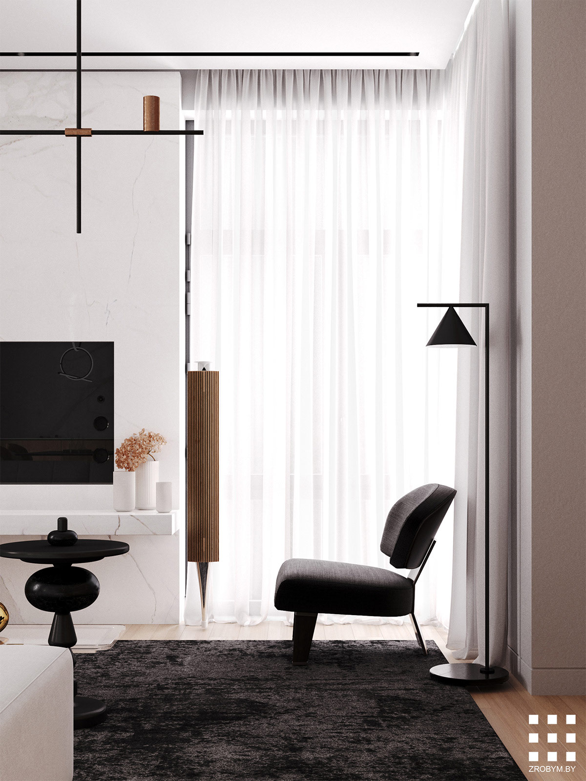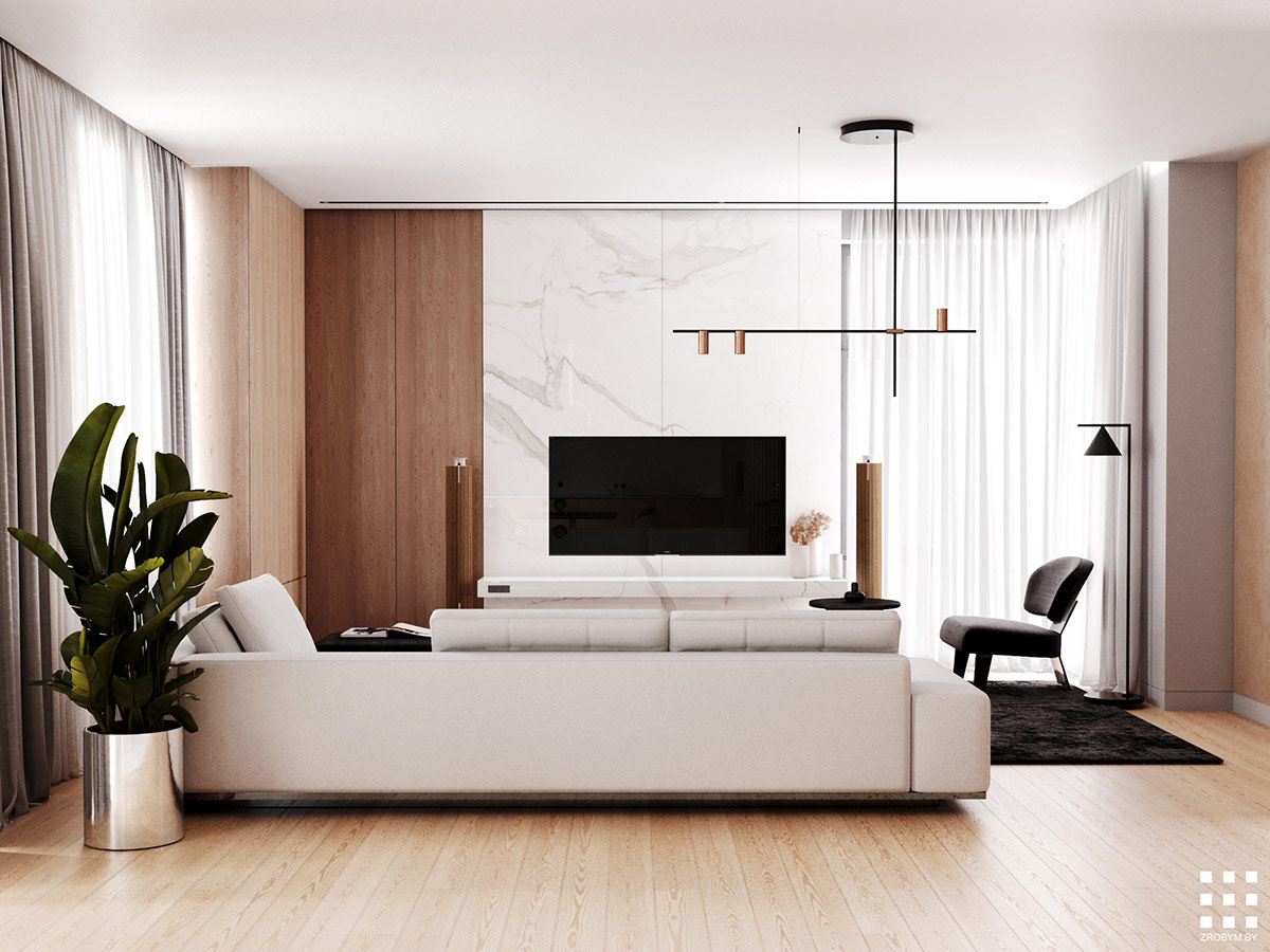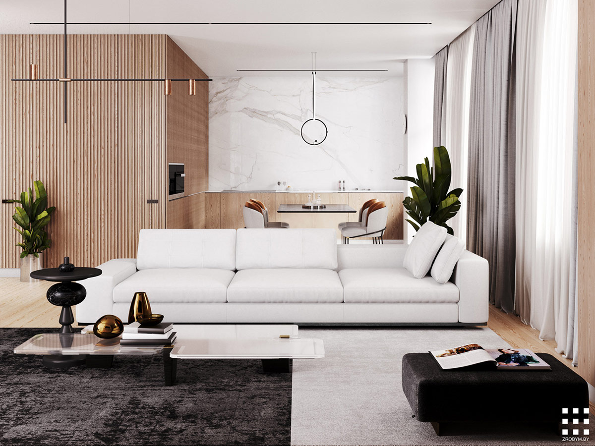 Наш последний интерьер из белого и светлого дерева — это дом площадью 113 квадратных метров в Минске, Беларусь. Хромированное кашпо дополняет утонченный дизайн гостиной гламурным аксессуаром.