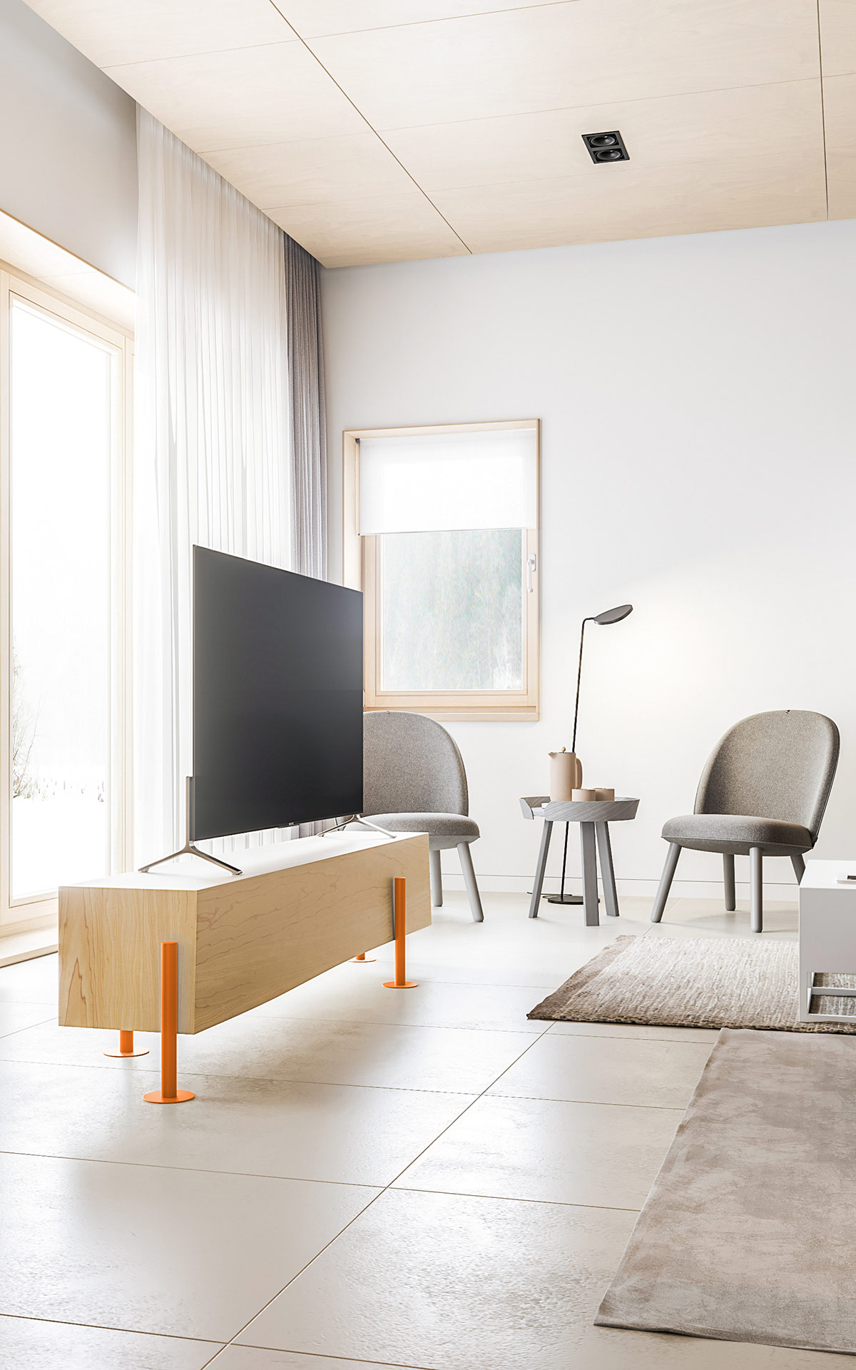Приподнятая тумба под телевизор позволяет естественному свету из окна проникать внутрь. Из небольшой гостиной зоны открывается вид на сад.