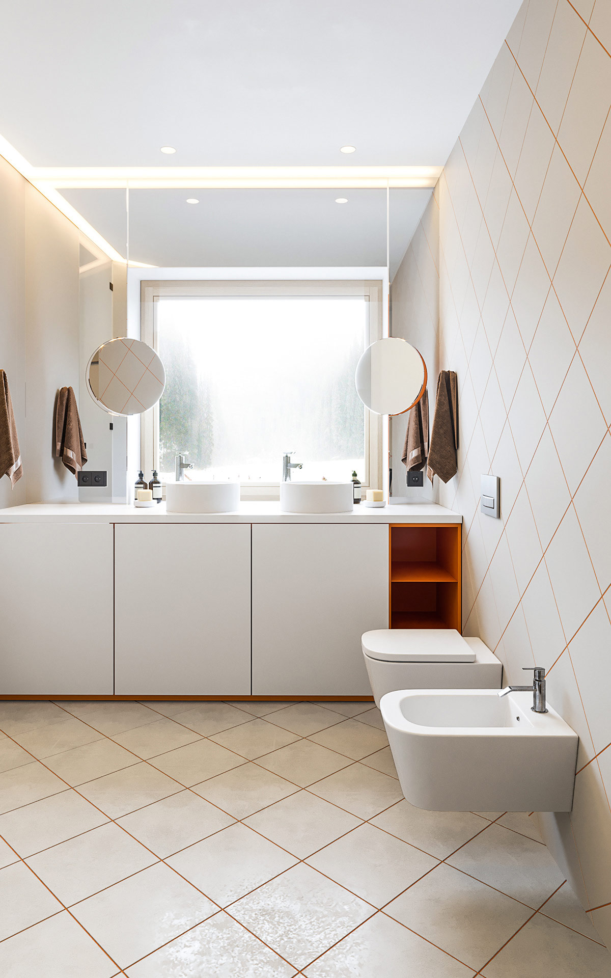 В ванной возвращается оранжевый акцент. Оранжевые полки и соответствующий цоколь придают дополнительный интерес ряду простых белых туалетных столиков. Оранжевая затирка рисует ромбовидные образования на кафельных стенах и полу.