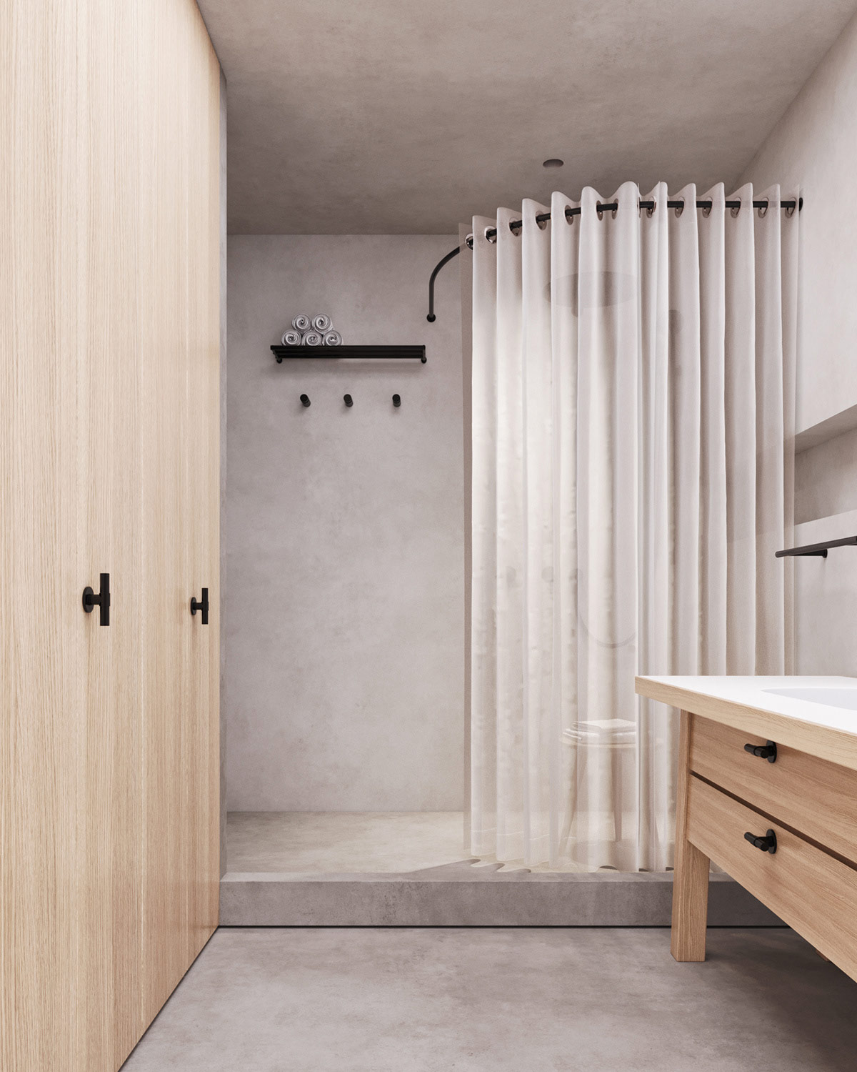 Изогнутая душевая штанга закрывает занавеску вокруг душевой кабины, приподнятой над бетонной влажной зоной.