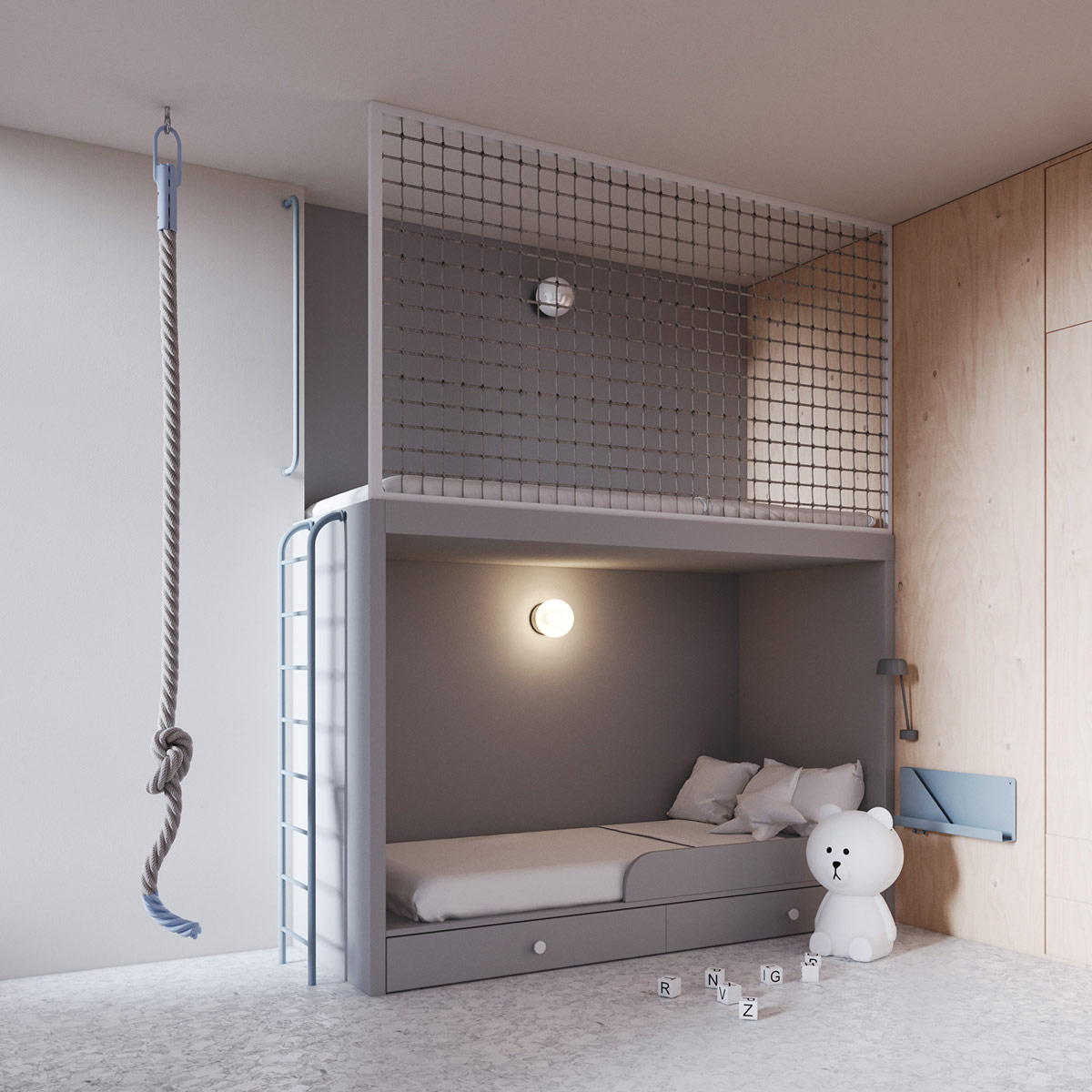 В следующей детской комнате грузовая сетка добавляет безопасности и забавного стиля игровой койке. Больше идей для детских кроватей ищите здесь.