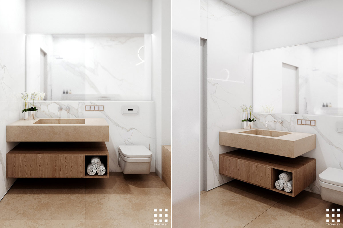 Уникальная тумба в форме трапеции в ванной комнате привлекает внимание.