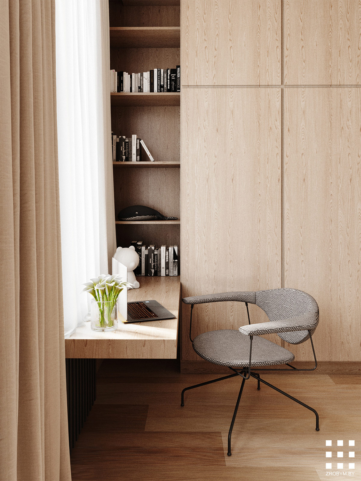 Дизайнерское кресло для рабочего стола сочетается с плавающей деревянной конструкцией стола, которая сливается с утопленными книжными полками.