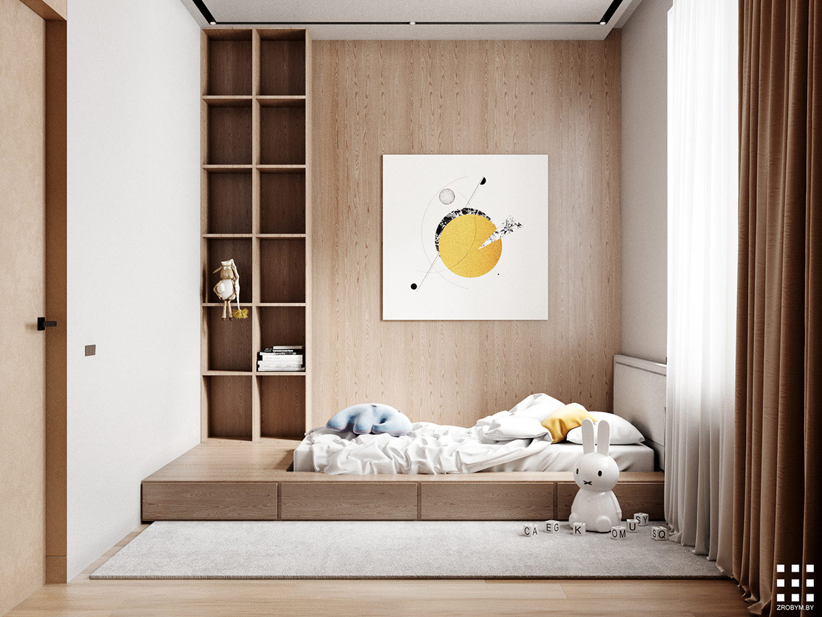 Детская комната имеет аккуратный дизайн напольной кровати с ящиками для хранения и встроенной башней из полок для игрушек. Деревянные панели завершают единую композицию.